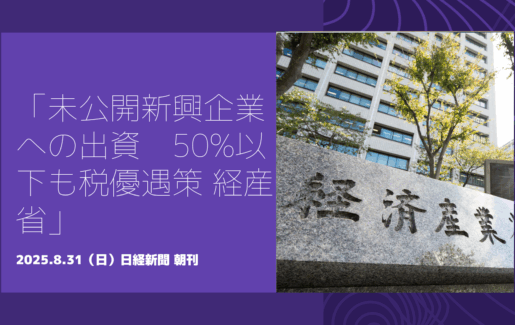 2025.8.31(日)「未公開新興企業への出資 50%以下も税優遇策 経産省」日経新聞 朝刊