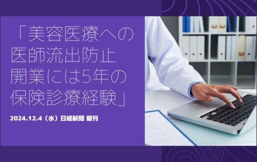 2024.12.4(水)「美容医療への医師流出防止 開業には5年の保険診療経験」日経新聞 朝刊
