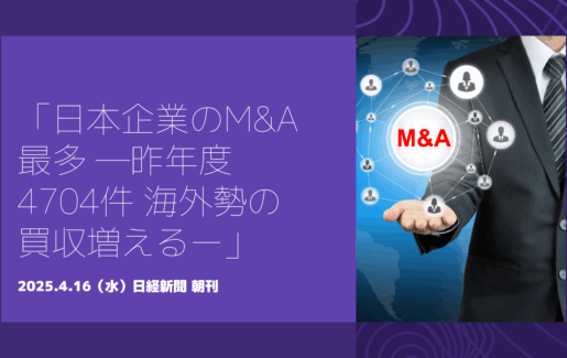 2025.4.16(水)「日本企業のM&A 最多 ―昨年度4704件 海外勢の買収増えるー」日経新聞 朝刊